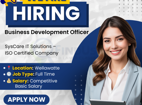 🛡️ ISO Certified | 🇦🇺 Australian-Based Parent Company | 📚 Educational Training | 📈 Digital Marketing | 💻 Managed IT ServicesSysCare IT Solutions, a leading ISO-certified company with its parent company based in Australia, is seeking a dynamic and self-driven Business Development Officer to join our growing team in Sri Lanka.🔹 Key Responsibilities:Directly engage with potential and existing customersBuild and maintain long-term client relationshipsPromote and present our services confidently and professionallyIdentify new business opportunities and contribute to sales growth🔹 Requirements:Strong communication skills and a professional personalityBasic IT knowledge (to understand and present our services effectively)Confidence in customer interactions – both in-person and onlinePrior experience in business development or sales is an added advantage🔹 What We Offer:Competitive basic salaryAllowances (if travel is required)Attractive performance-based bonuses and commissionsA supportive work environment with career growth opportunities📧 Apply Now: Send your resume to jobs@syscare.lk